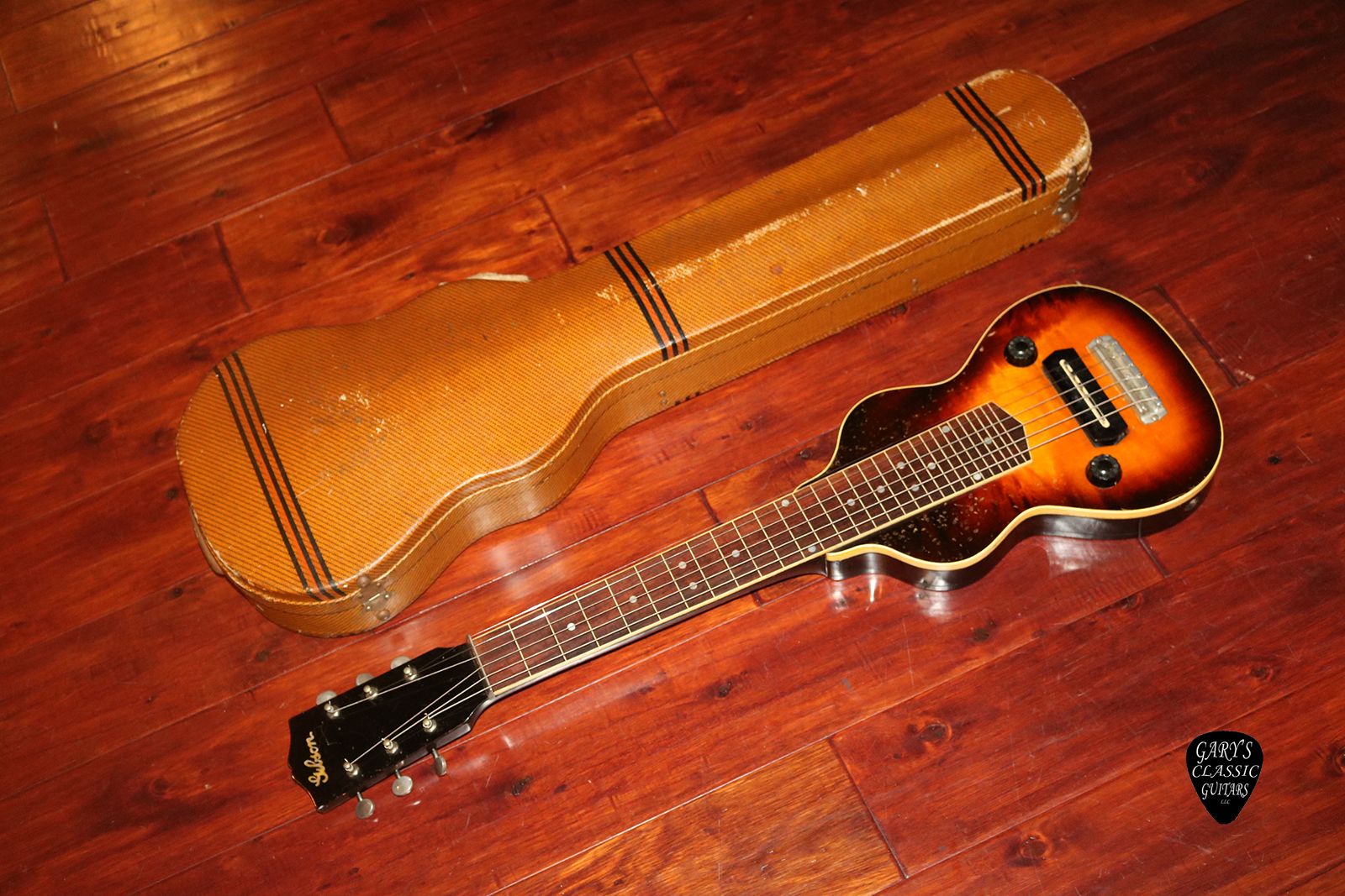 1936 Gibson EH-150 Lap Steel, Rare early model with Charlie Christian pickup, Lovely instrument with a nice looking figured Maple build and a beautiful Amber sunburst finish, VG++. Original Tweed airline striped case