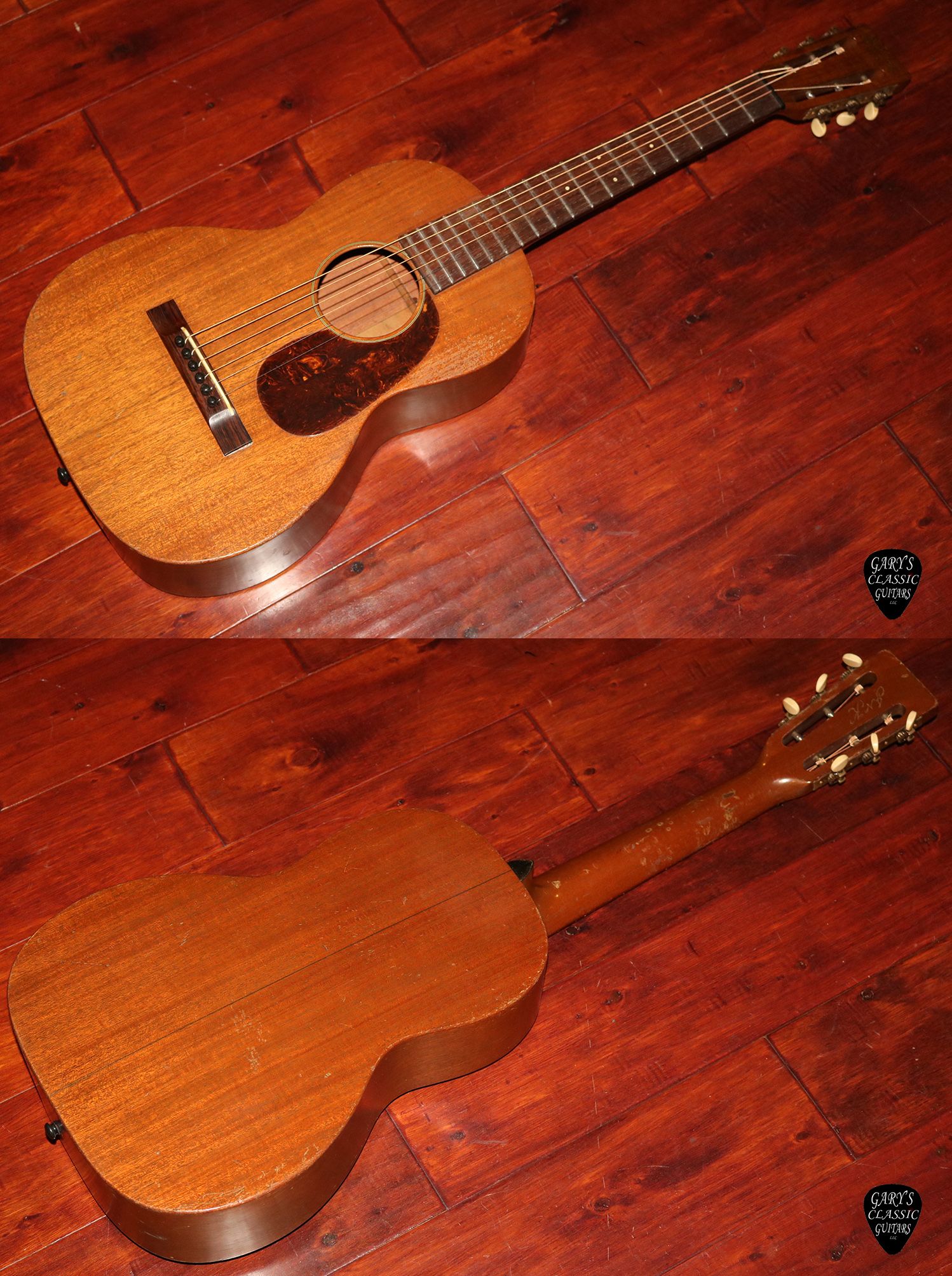 1939 Martin 5-17, Mahogany guitar with an open and warm tonality that projects brilliantly, 21.5 inches scale length 11.25 inches wide at the lower bout, 8 inches wide at the upper bout, 3 5/8 inches deep, 1 11/16 inches wide nut width, X braced, Recent neck reset,VG++, Clean non original vintage soft case