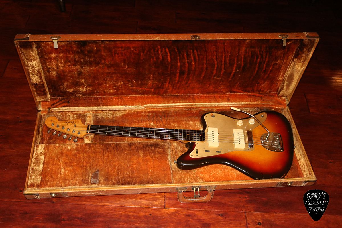 1959 Fender Jazzmaster, Anodized pickguard, Dark Brazilian Slab Board, Lovely Birdseye Maple neck, Original Sunburst finish, Spaghetti logo, Clay dots, Floating Tremolo, Bridge cover, Wonderful example, VG++, Original Tweed Hard case