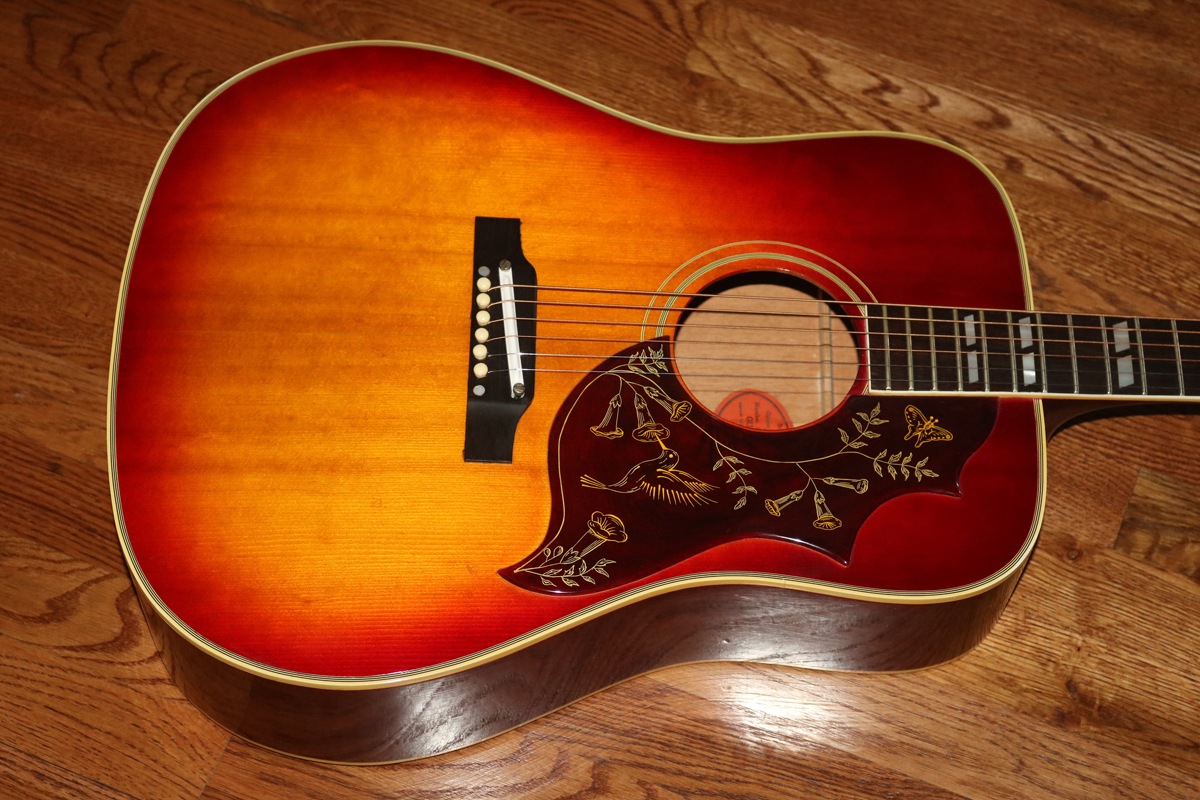 1961 Gibson Hummingbird, Cherry Sunburst, Hard to find guitar, Second year of production, Gold hardware, Adjustable bridge with White ceramic insert, 1 & 11/16 inches wide at the nut, Gorgeous instrument, Fine sounding, Excellent condition, Original hard case