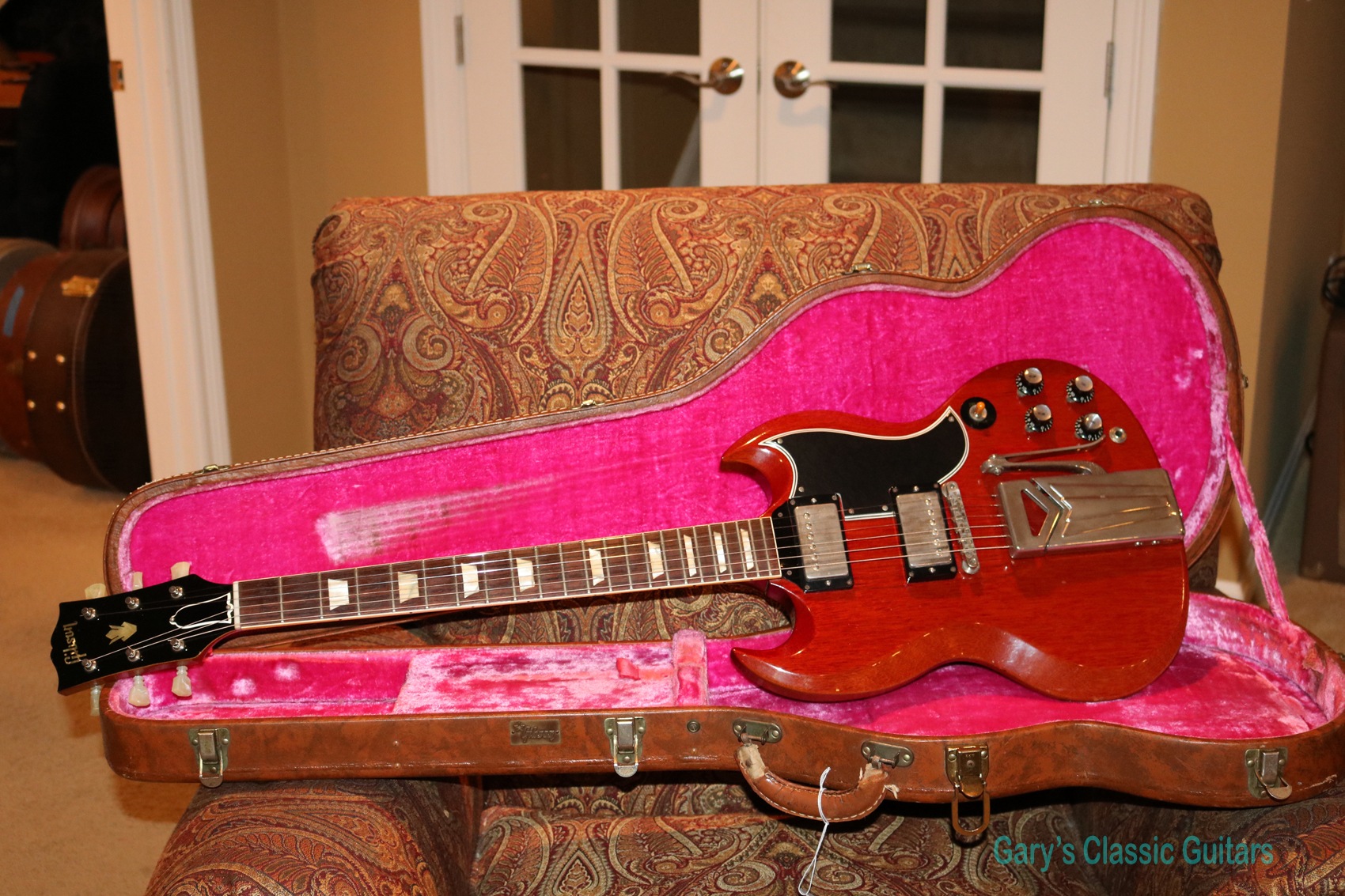 1961 Gibson SG Les Paul Standard, Two PAF’s, Cherry Red, Sideways Vibrola, All nickel parts, Single line Klusons, Nice wide neck! Plays & sounds great!!! EC, Original Brown Hard Case with Pink Lining