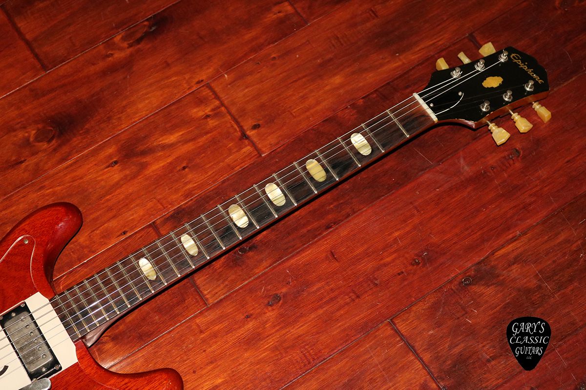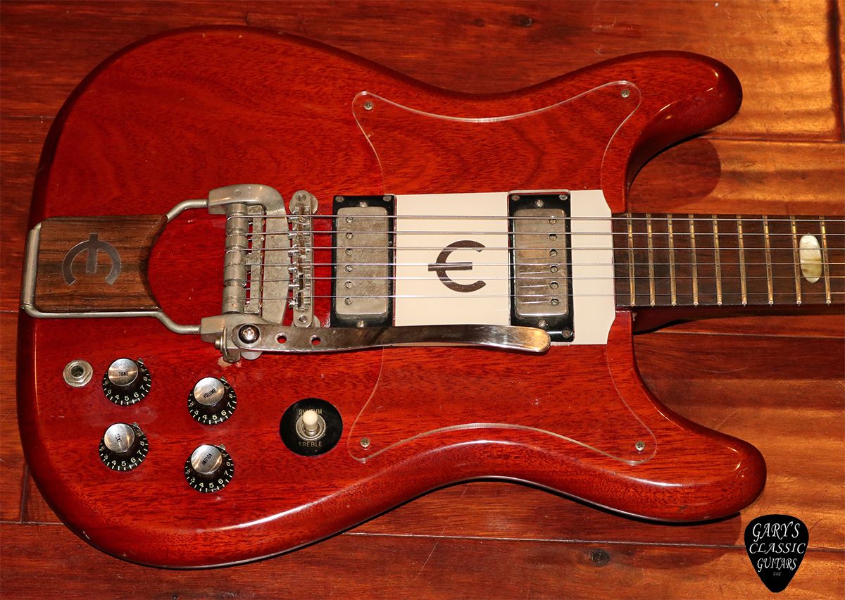 1962 Epiphone Crestwood Custom, Cherry Red, Slab Mahogany body with see through pickguard, Two mini humbuckers, “E” Vibrola, Had some other tuners on it and perfect repro tuners now installed, 1 & 11/16 inches wide at the nut, Weighs just 6 lbs 9 oz, Lively and resonant, EC, OHSC