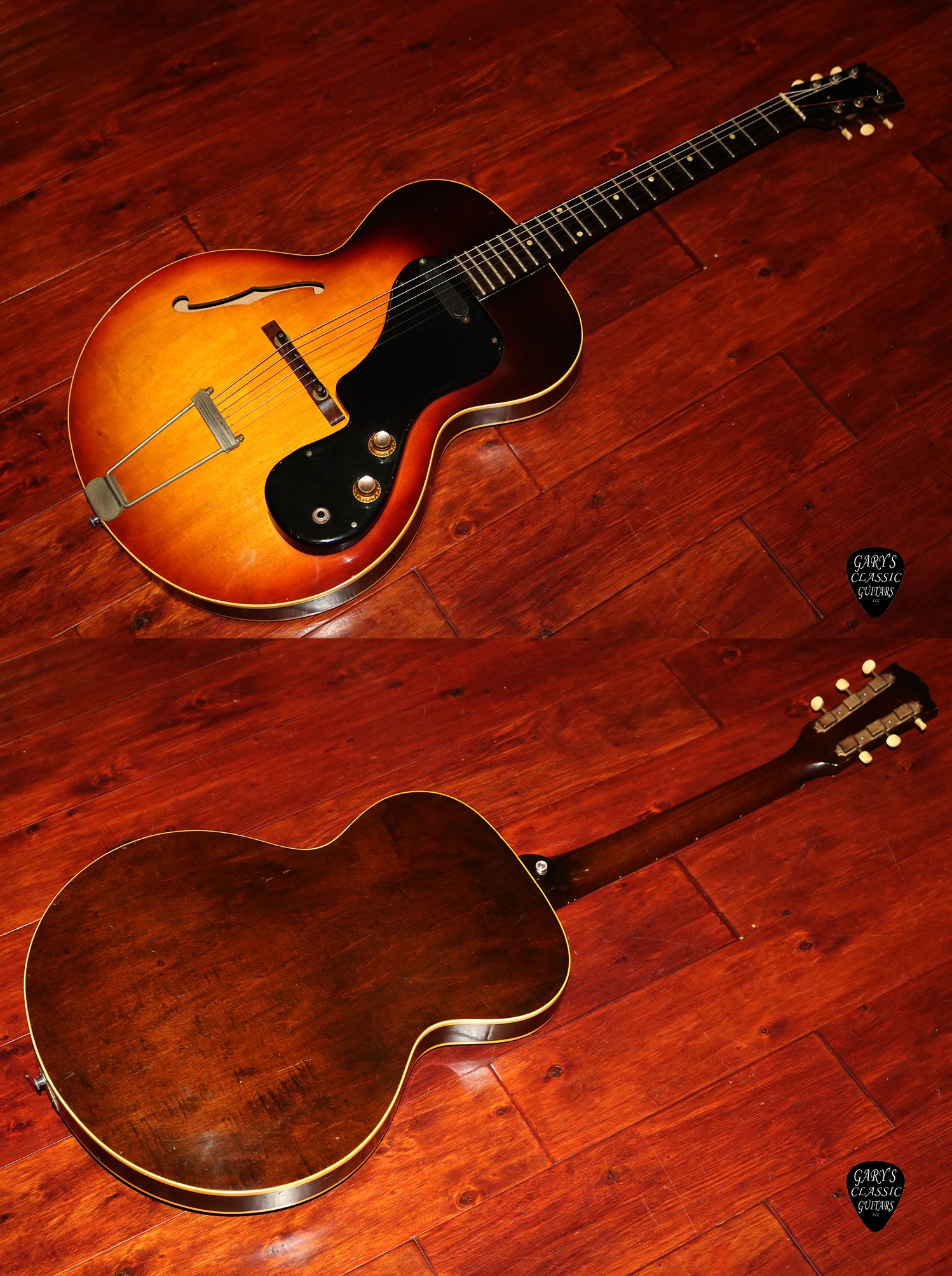 1962 Gibson ES-120 T, Thinline hollowbody, Tobacco Sunburst finish, Attractive Maple back, Bubble guard, Sweet sounding single coil pickup, Wide at the nut, Nickle parts, Light weight, Fine player, VG++, NHSC, $2,495
