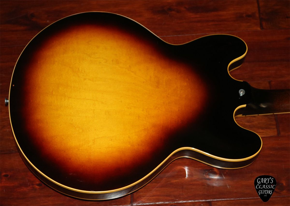 1963 Gibson ES-335 TD, Original Stop tail piece, Sunburst finish, PAF in the bridge position and PAT # Humbucker in the neck position, Lightly figured Maple top and back, 1.65 inches wide at the nut, Original single line Kluson tuners back on, All Nickels part, “Mickey Mouse” ears, Sweet playing and superb sounding, Bought from the original owner with a photo from back in the day!, EC, Original hard case,
