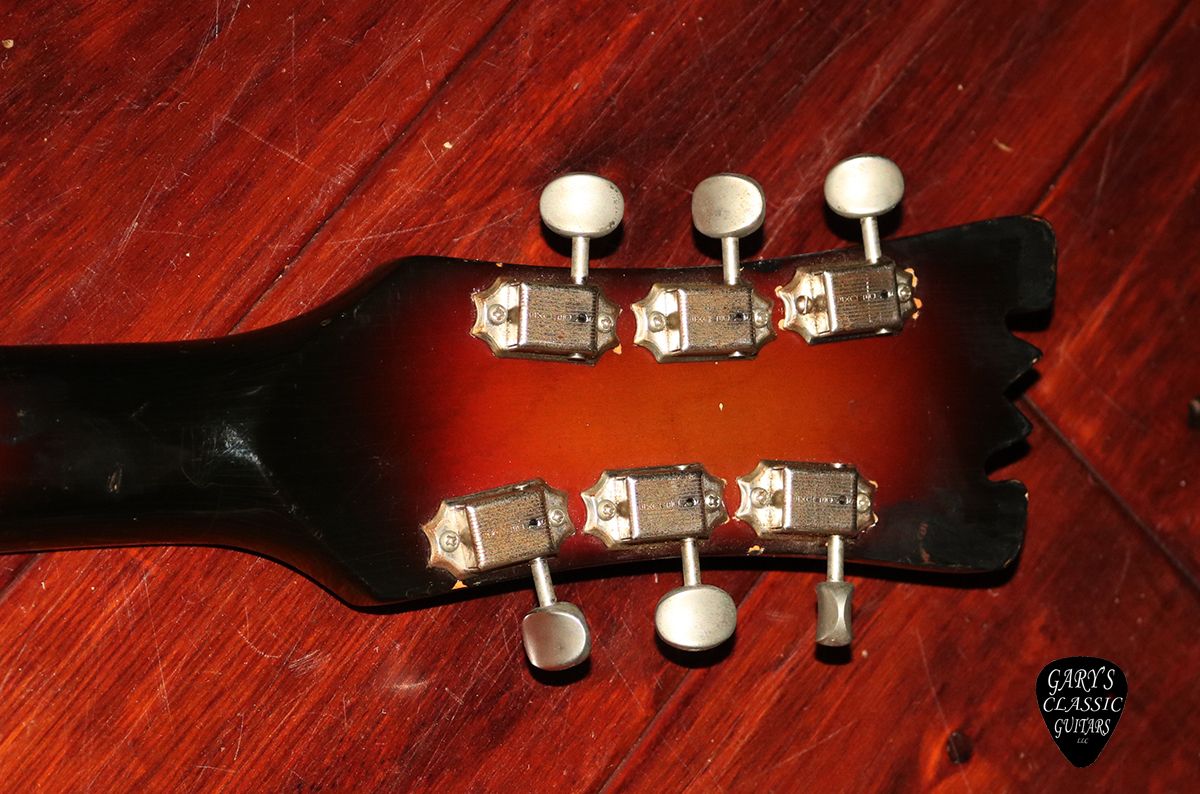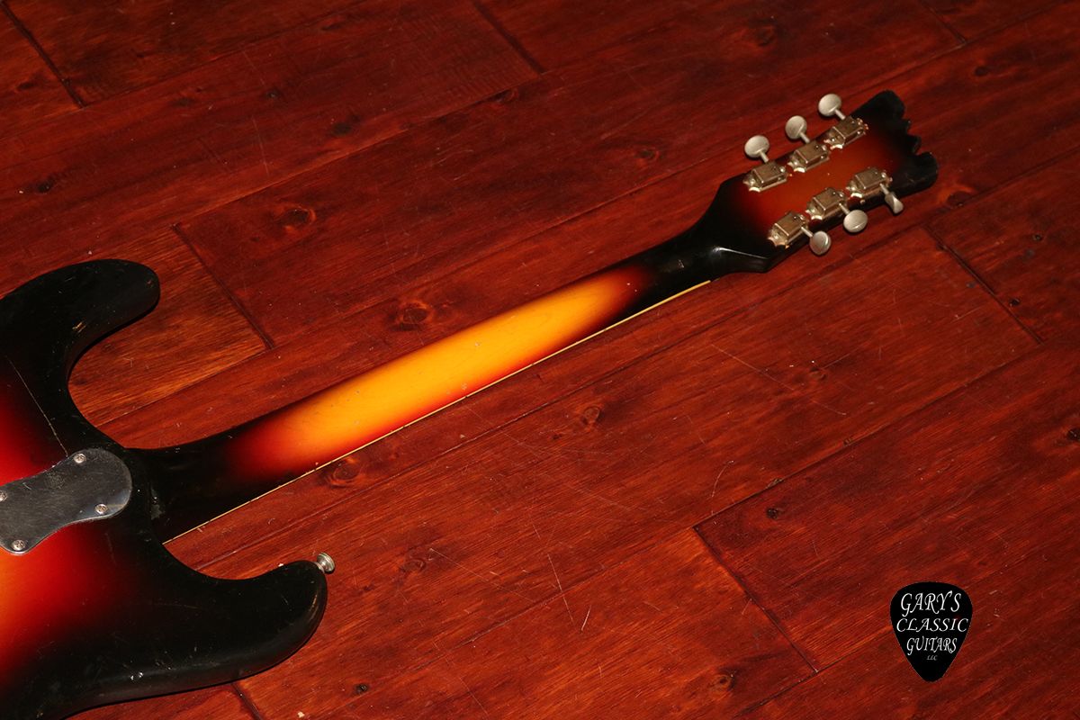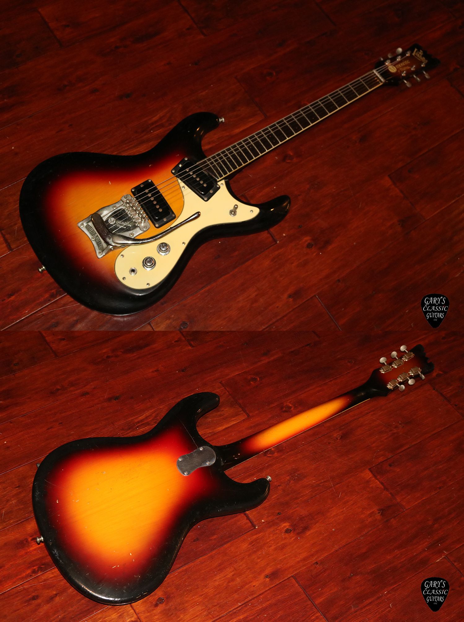 1963 Mosrite “The Ventures” Model, Sunburst including the headstock with early large logo, This is a fast player with a slim wide neck profile, Sounds great with original hand wound pickups, Previously had a humbucker in the neck position leaving a slightly enlarged route, Beautiful early example with great vibe, VG++, Early style Brown case with Red velvet lining, $6,995