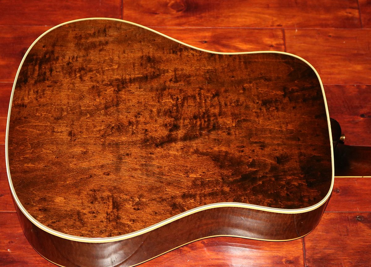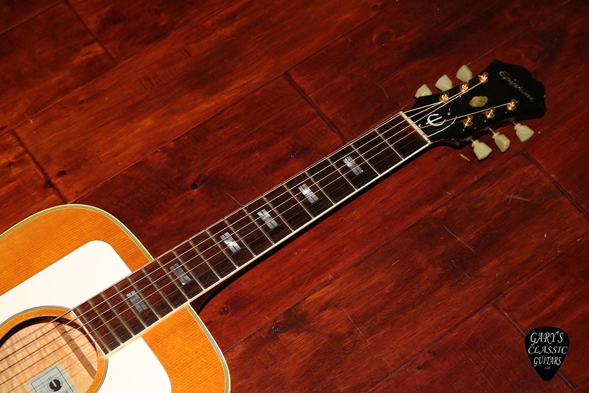 1964 Epiphone Troubadour FT-98, Rare model from the folk boom era, Nice early example, Spruce top, Stunning Maple back & sides, Gold Kluson single line tuners, Two inches wide nut width, Dual White pickguards, Added piezo passive pickup, Big full sounding guitar that is ready to play! EC+, Original Grey hard case