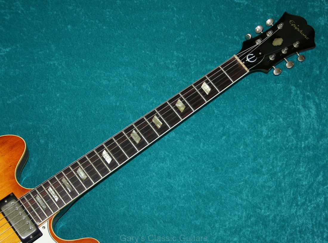 1965 Epiphone Riviera, Beautiful Iced Tea Sunburst finish, Two Mini Humbucking pickups, All Nickel parts, 1 & 5/8 inches wide at the nut, “Frequensator” tailpiece, Superb sounding, Very attractive example, EC+, NHSC, $6,995
