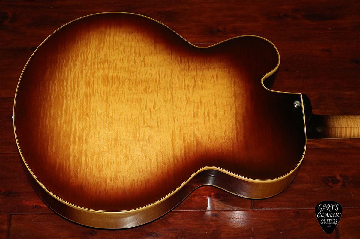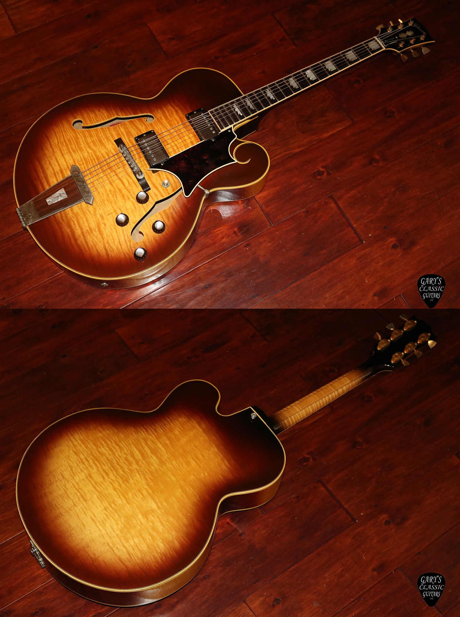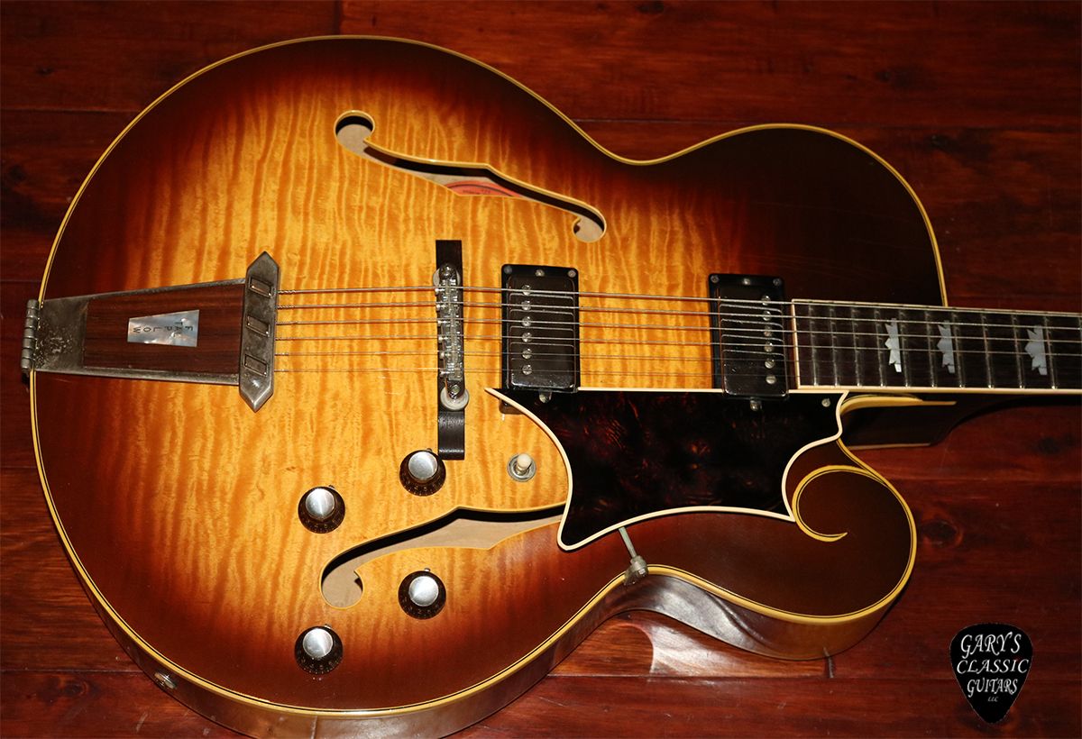1965 Gibson Tal Farlow, Rare Artist model, Super flamed Maple, Viceroy Brown Sunburst, Venetian cutaway with scroll, Two patent number sticker Humbucking pickups, Deluxe Gold tuners, Tal Farlow tailpiece, 1.625 inches wide at the nut, 17 inches wide at lower bout, Great low action, One owner, Super great guitar! EC+, Beautiful clean original hard case, $18,995