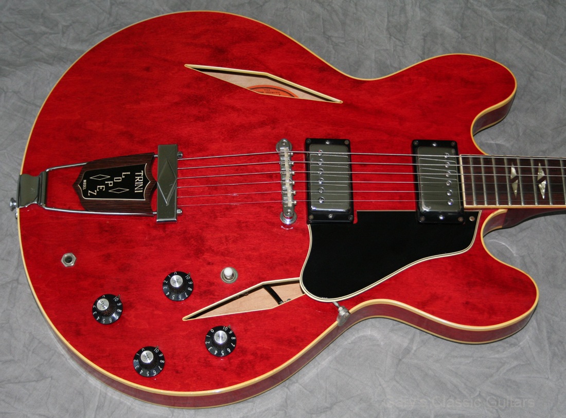 1968 Gibson Trini Lopez Standard, Cherry red, Firebird style headstock, Bound Rosewood fingerboard with Split Diamond Pearl inlays, Diamond shaped sound holes, Two Humbucking pickups, Very Fine instrument, VG++, Original hard case, $5,995