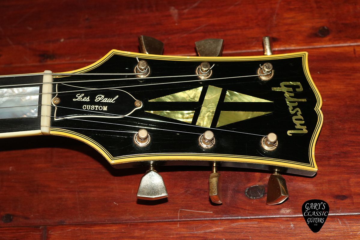 1969 Gibson Les Paul Custom, No volute, No made in USA, No dot of the I, One piece body, Three Piece neck, Stamped small “2” on the back of the headstock, finish check line between the two pickups by low “E” string, Pro neck reset, Weighs 9 lbs 3 oz, Awesome sounding patent sticker humbuckers, Sprague cap, Plays great! EC, NHSC